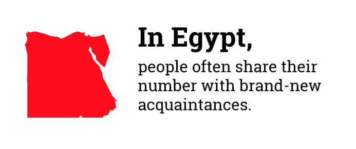 Cell phones are immensely popular here, and people aren’t shy about sharing their number with brand-new acquaintances. Taking down someone’s number, even if just to be polite, comes with the expectation that you’ll answer their calls or at least give them a ring back. If it all seems overwhelming, remember that this is just a modern take on traditional Egyptian hospitality.